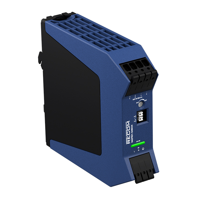 The slim RACPRO1-S120 is a high reliability, single phase AC input, 120W DIN Rail mount power supply in extremely compact dimensions of 100 x 112mm with a width of only 28mm and 12V, 24V or 48V output. It is specially designed for demanding applications in the harsh industrial automation field with an extended return voltage immunity making it suitable for safe operation against back feeding loads like decelerating motors and inductors. These units will deliver up to 120W over the full -40°C to +60°C ambient temperature range with only convection cooling. An extended power bonus of up to 144W at 45°C plus a power boost of up to 150% for 5s makes them suitable for powering highly inductive or capacitive loads. The unique and innovative modern design with 25° push-in connectors allows easy tool-less installation or replacement. The product is certified according to the global safety standards IEC/EN/UL 61010-1 and IEC/EN/UL/CSA 61010-2-201. Electromagnetic radiated and conducted emissions are compliant to heavy industrial EN 61000-6-4 Class B emission standard and EN 61000-6-2 immunity standard.
